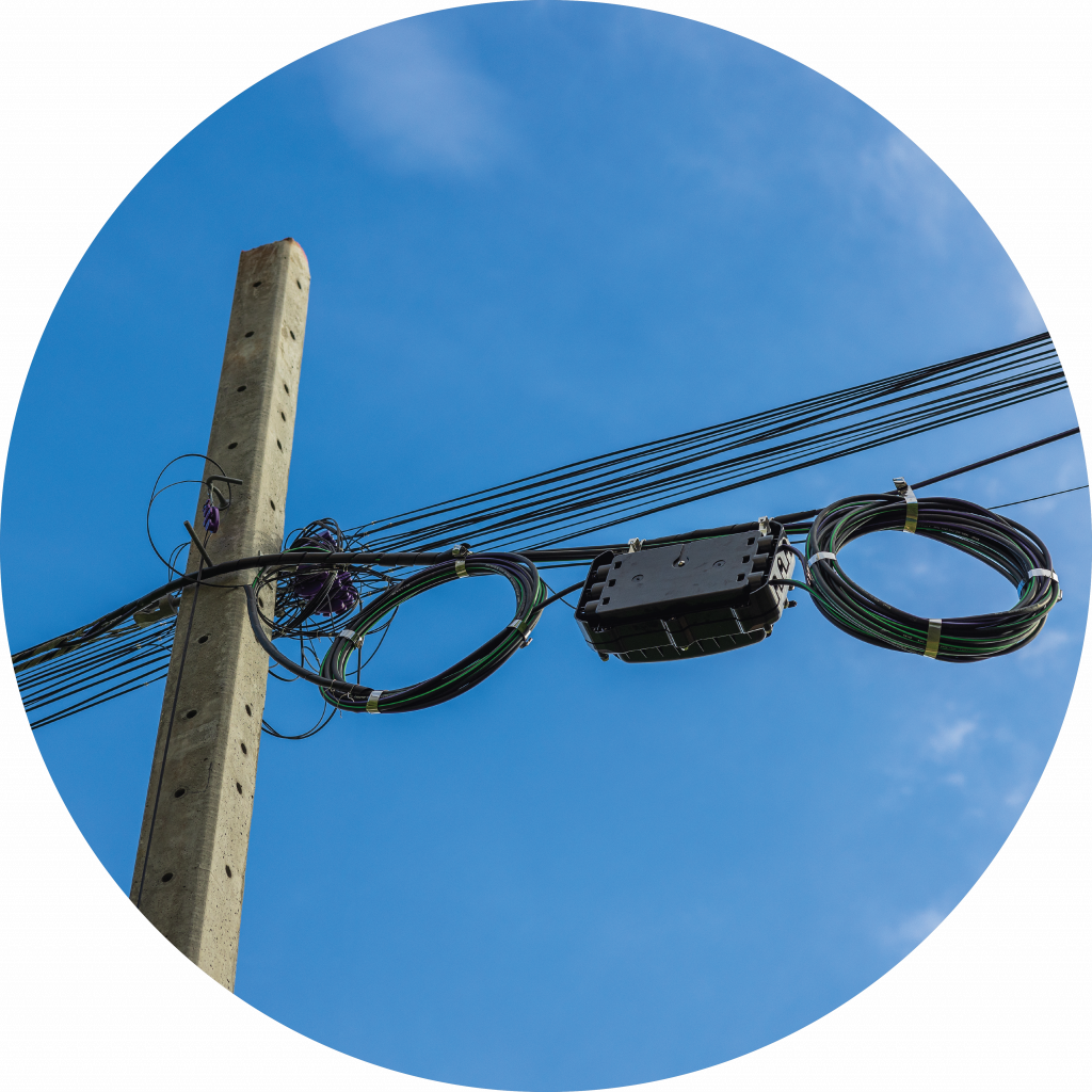 Overhead installations connect you to our fiber network via the power lines. On the day of your installation, our technicians will pull your dedicated fiber line from the nearby power poles directly into your home, typically where your power connection attaches to your home.